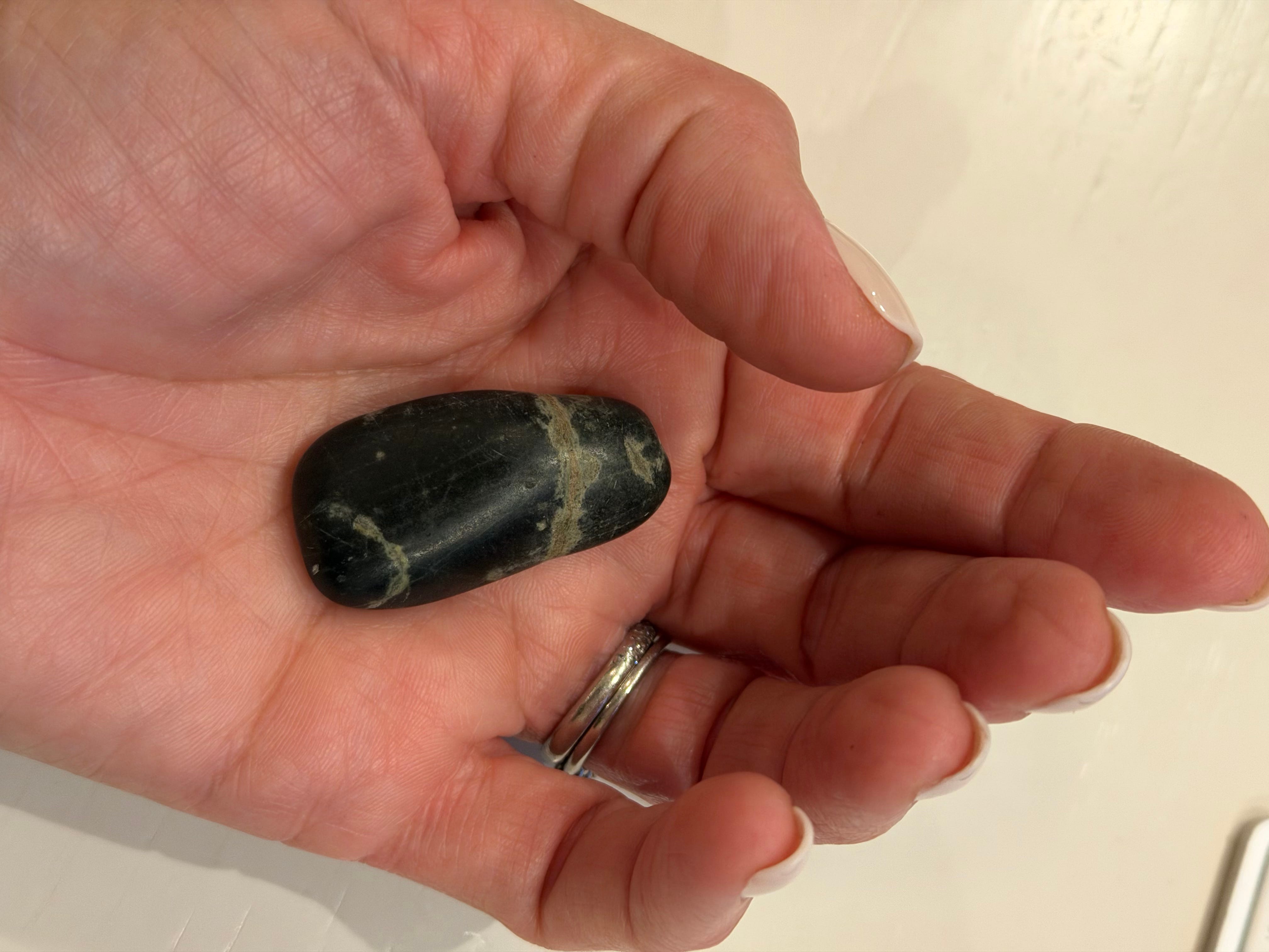 I’ve passed countless stones on this daily walk, but one called to me yesterday, asked me to carry it. Small, brazil nut sized, one stripe near its top. I bent over, picked it up, obedient. Curled my fingers around, then pressed it to my heart and made a circle. Stone, wisest earth element, had something to offer me, something to say about resilience. Grandfather stone rests in my collarbone now, tells me not to despair, says nothing stays, even evil. The rock’s lines tell stories of disruption, division, violence, fire, and still, when I hold it, it borrows my heat, warms itself, my body not yet returned to earth, not yet ready to be carried.